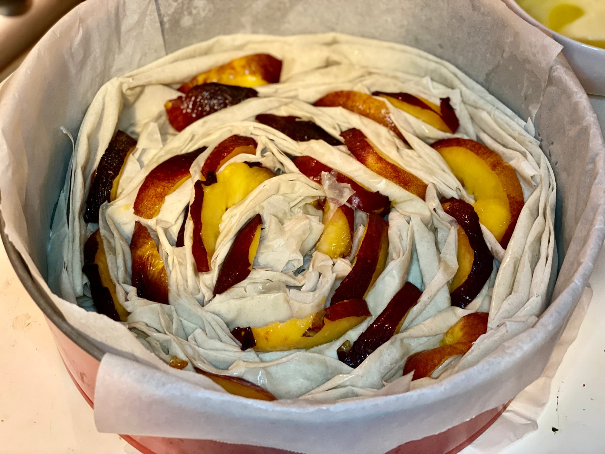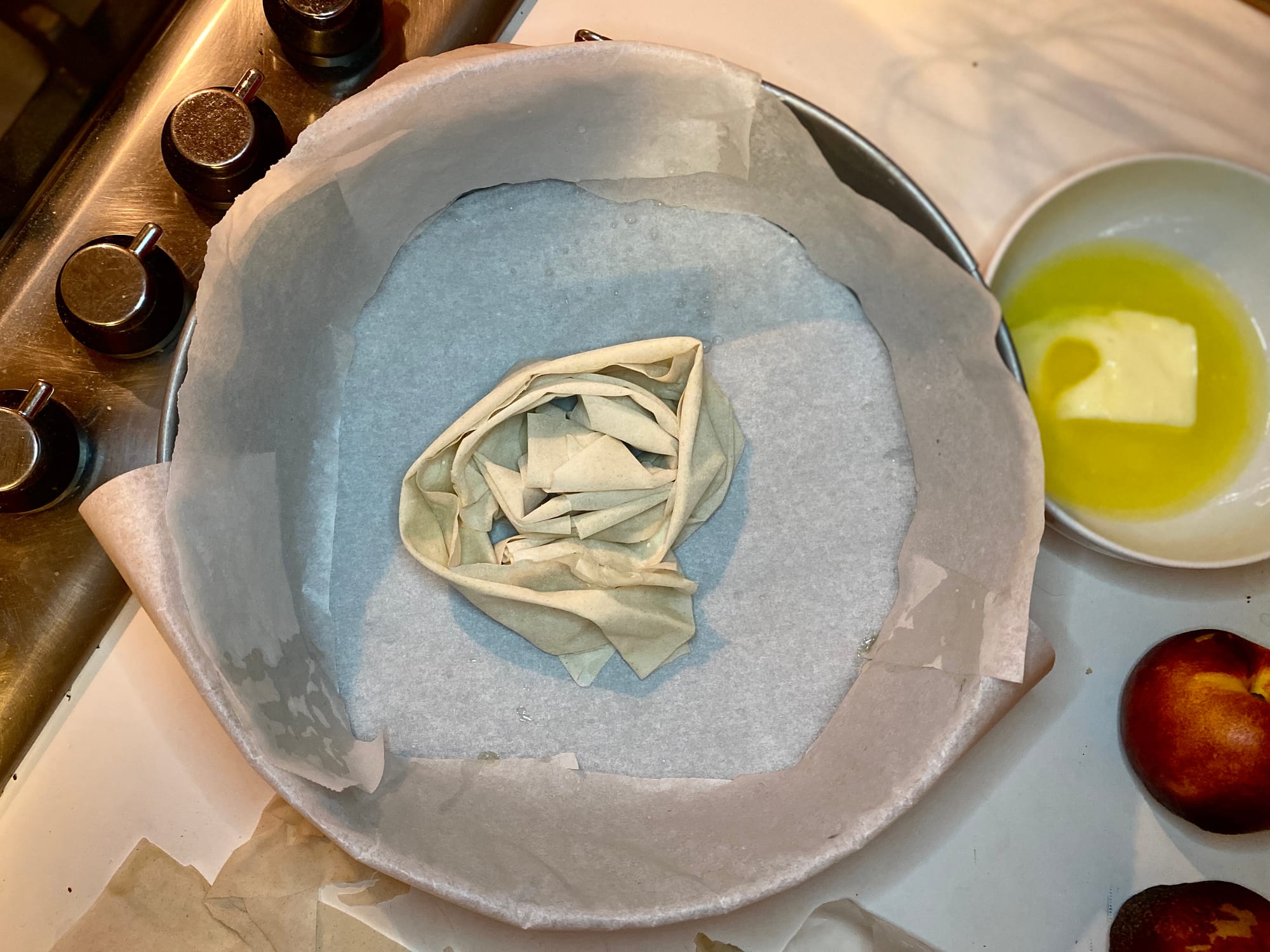A questo punto procedere infilando fettine di pesca nelle pieghe della pasta fillo con un occhio alla gestalt e uno a quante ne restano ancora.