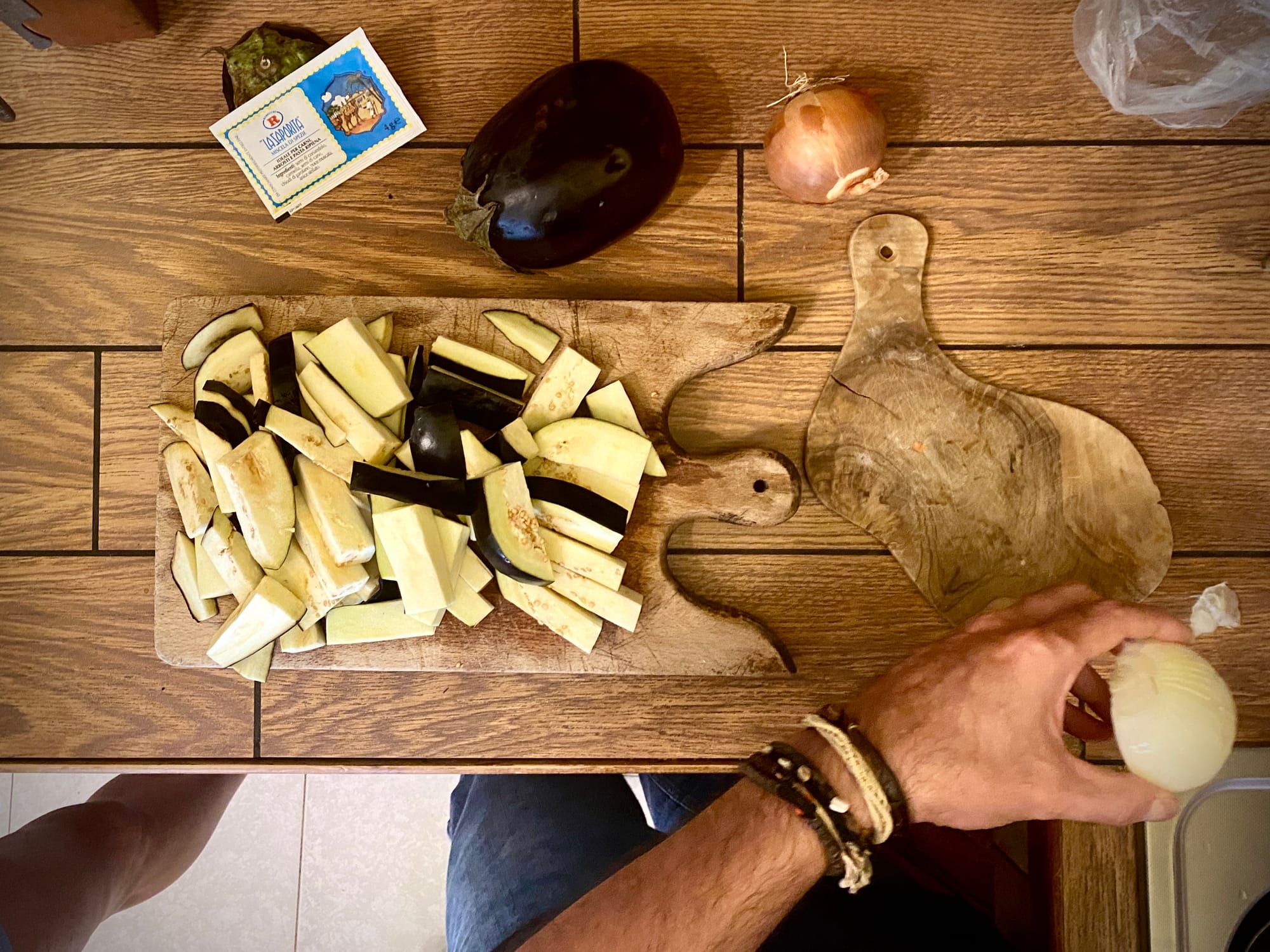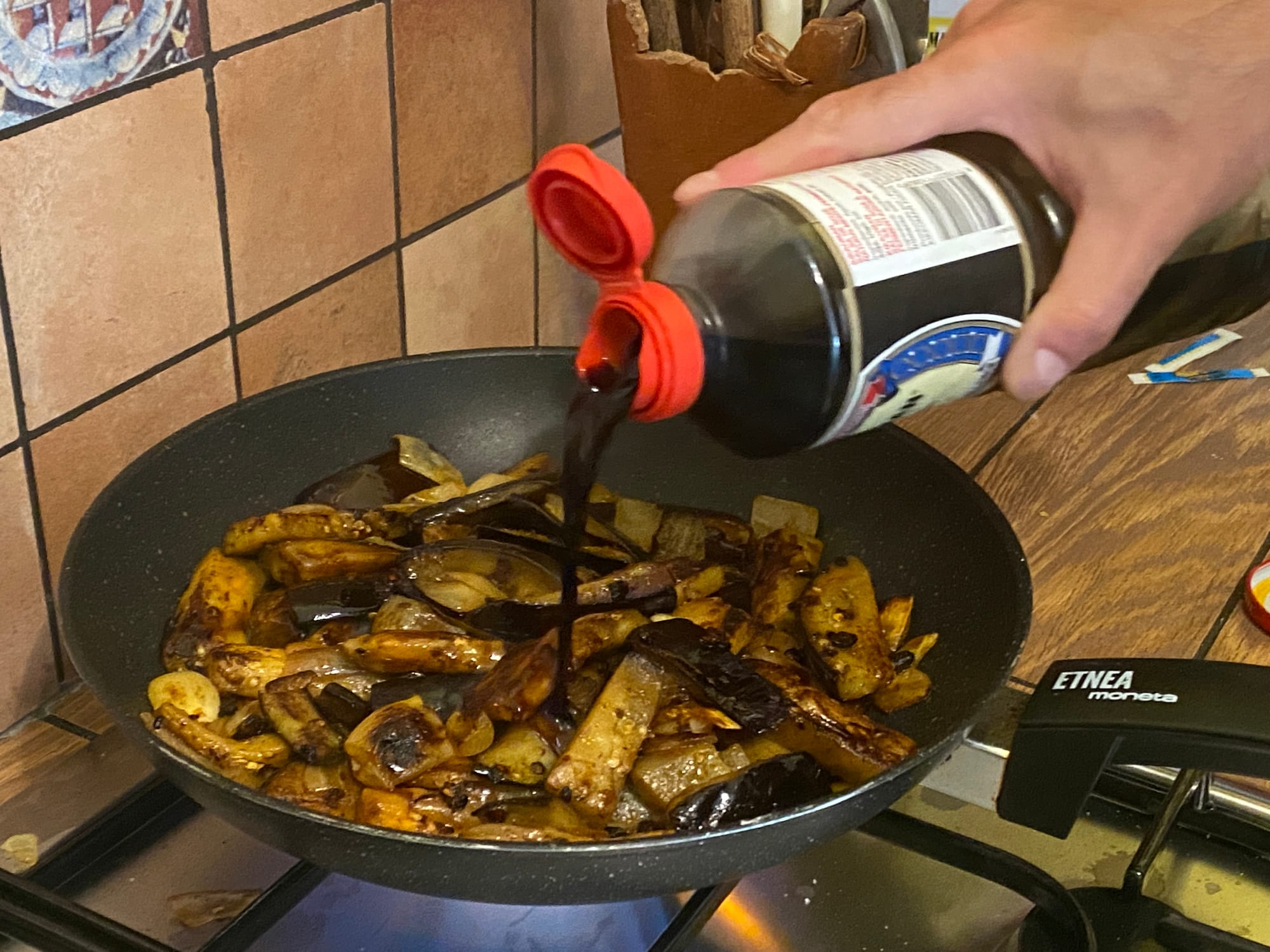 - Quando pare che il colore delle melanzane sia passato a una sfumatura terra di siena bruciata, bello e lucido, e le cipolle neanche si individuano più, spegnere il fornello e posare il tegame. Respirare. You did it right.