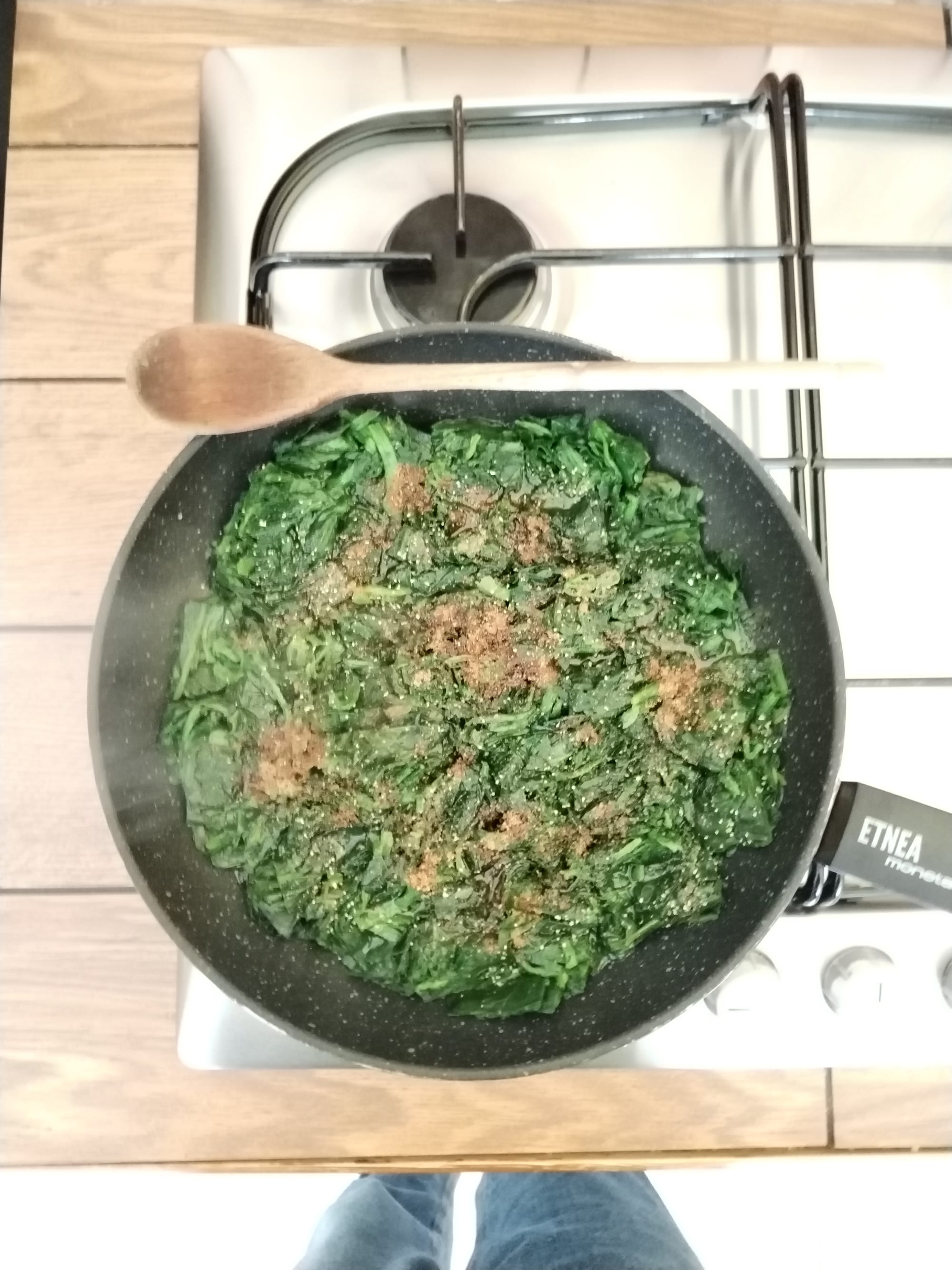 Gli spinaci, che siano freschi o surgelati, li fate cuocere a vapore con un po' di sale finché non si sono ammosciati per bene, cosi' occupano poco spazio in padella.