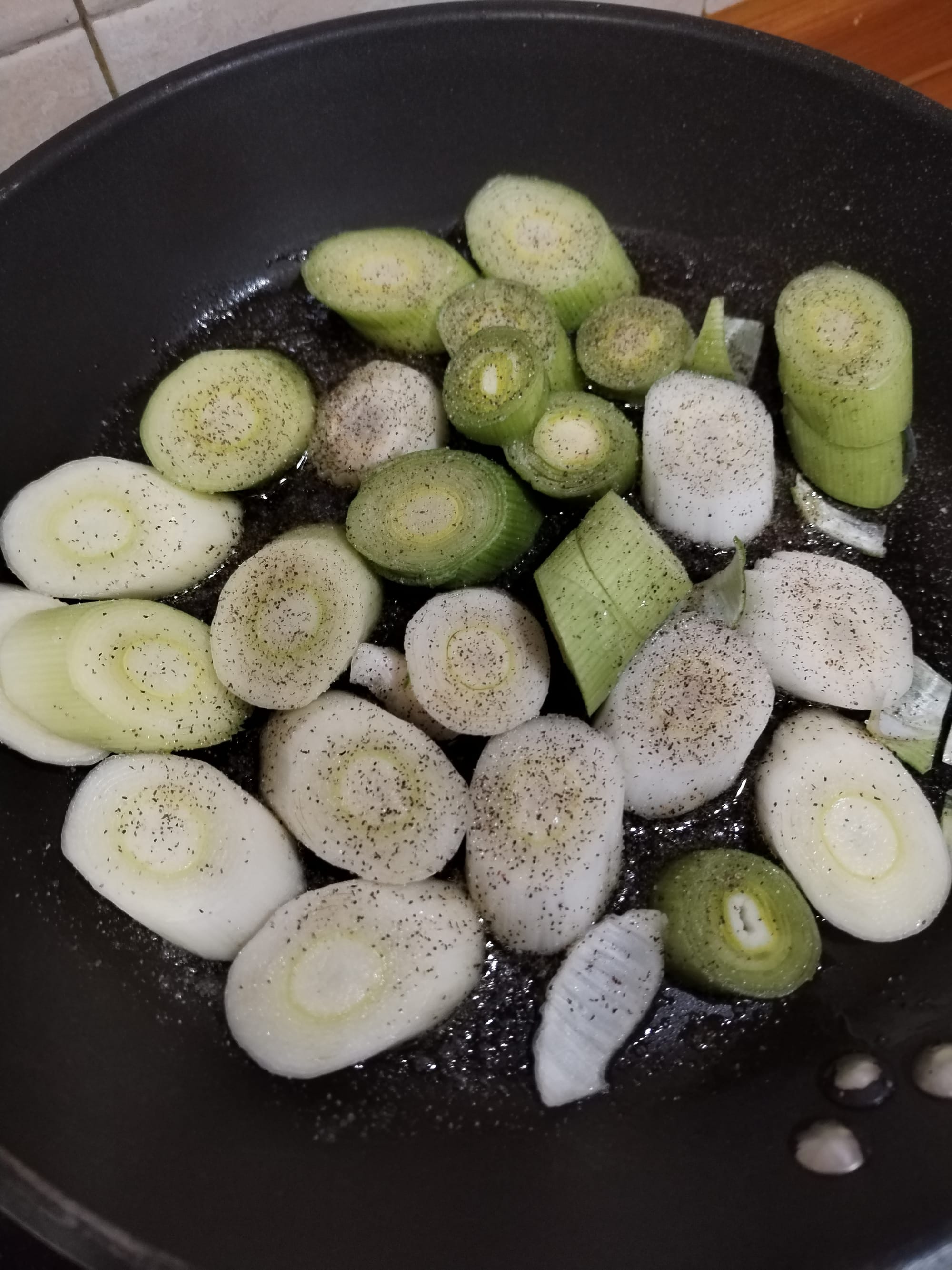 Fate rosolare il porro tagliato a rondellone nell'olio con sale e pepe in una padella che abbia all'incirca lo stesso diametro della pasta sfoglia. Ocio che la padella poi va in forno, quindi solo manico in metallo.