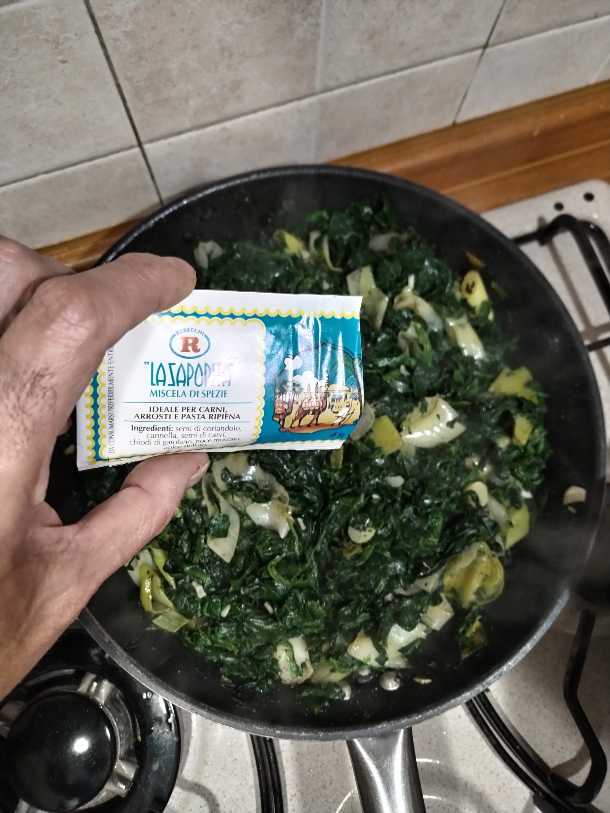 Quando il porro e' morbido e fragrante aggiungete gli spinaci gia' cotti al vapore e ben scolati. Fate saltare a fuoco alto per cinque minuti per eliminare un po' di acqua che potrebbe essere rimasta, aggiungete la Saporita, mescolate e fate insaporire per un paio di minuti.