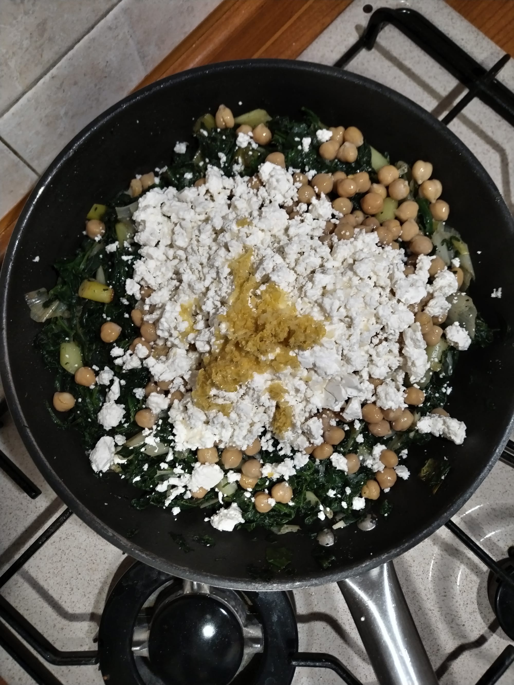 Regolate di sale e pepe, spegnete il fuoco e aggiungete i ceci, la feta sfragnata(tm), il succo e la scorza del limone. Mescolate tutto per bene e lasciate raffreddare cinque minuti per evitare ustioni ai polpastrelli nella fase successiva.