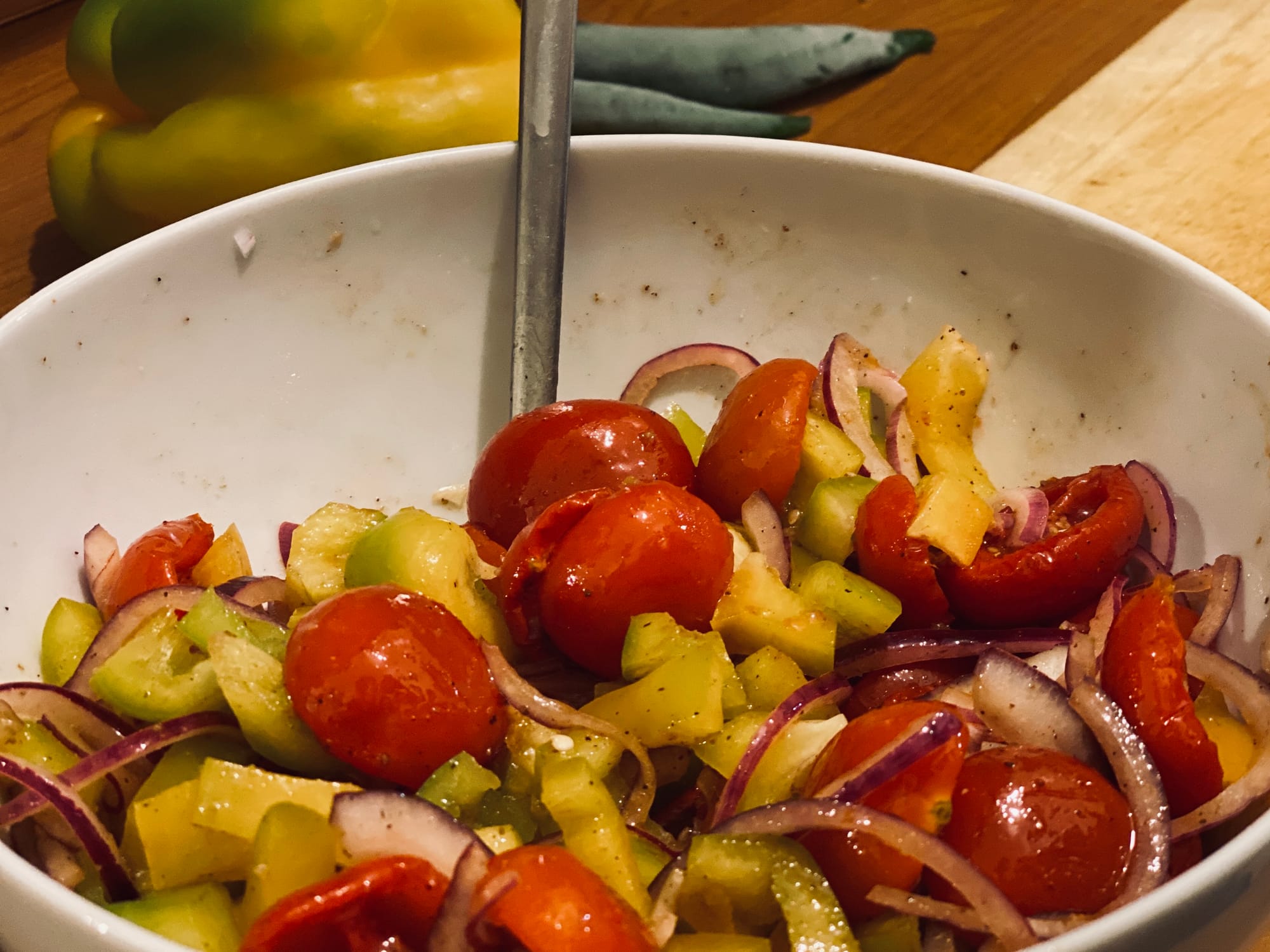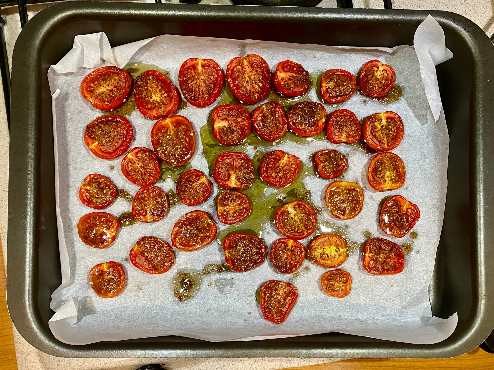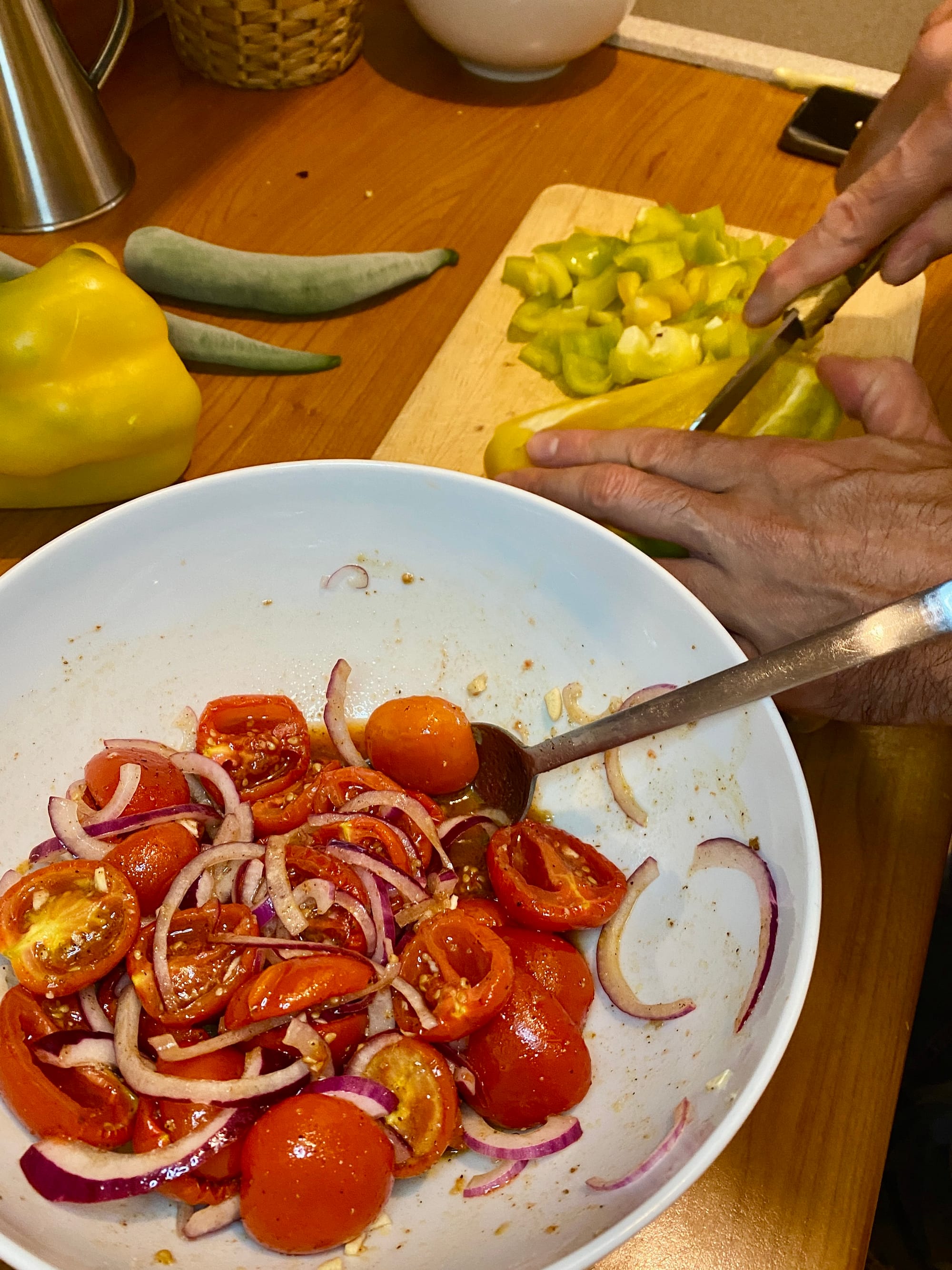 - Quando i pomodori saranno raggrinziti ma ancora succosi, tirateli fuori dal forno e mescolateli al peperone tagliato a tocchetti, al prezzemolo tagliato grossolanamente, alle cipolle marinate, all' altra mezza bustina di Saporita e a tutti gli altri ingredienti che son troppi e non mi ricordo.