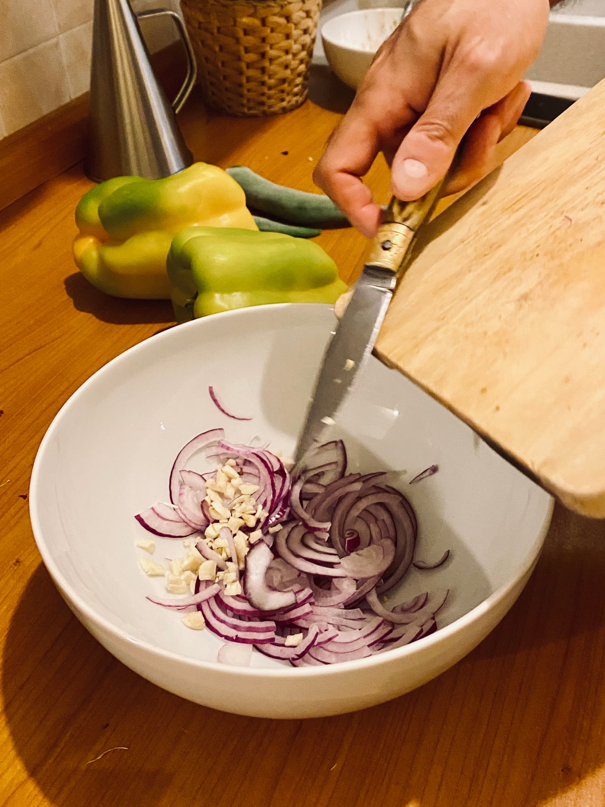 - Nel frattempo mettete a macerare la cipolla e l'aglio con l'aceto e il sale, poi dedicatevi serenamente alla vostra attività culturale preferita, che' come insegna il Vangelo secondo Bud Spencer "non di soli fagioli vive l'uomo".